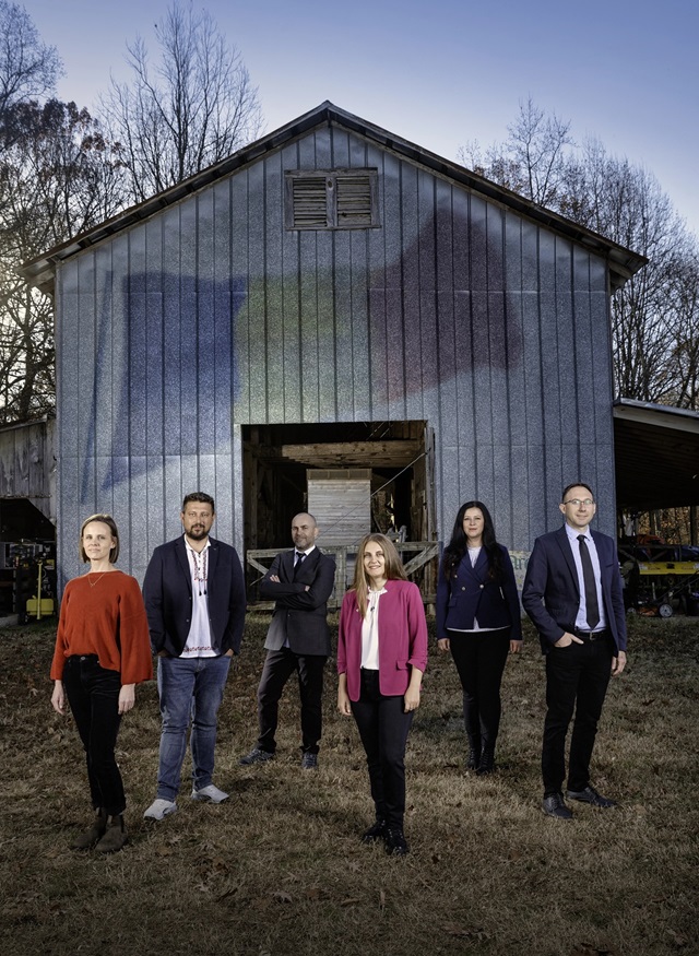 CAES Associate Professor Abigail Borron and Fulbright-RAF Scholars Mihai Șuteu, Daniyar Memedemin, Alina Zaharia, Andreea Ona and Daniel Chiciudean la UGArden. Photo by Dennis McDaniel